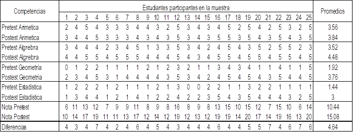 Se presenta la Tabla 1, que resume los resultados académicos de los estudiantes en distintas dimensiones del aprendizaje de las matemáticas. Se observan diferencias positivas en cada una de estas dimensiones, así como una diferencia total de 4.64 puntos entre el Pre Test y el Post Test.