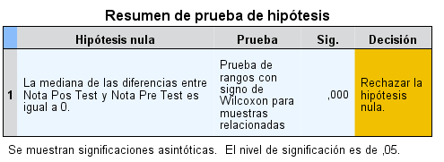 Nota. Reporte de prueba estadística no paramétrica, elaborado con el software SPSS, con base en Pre Test y Post Test